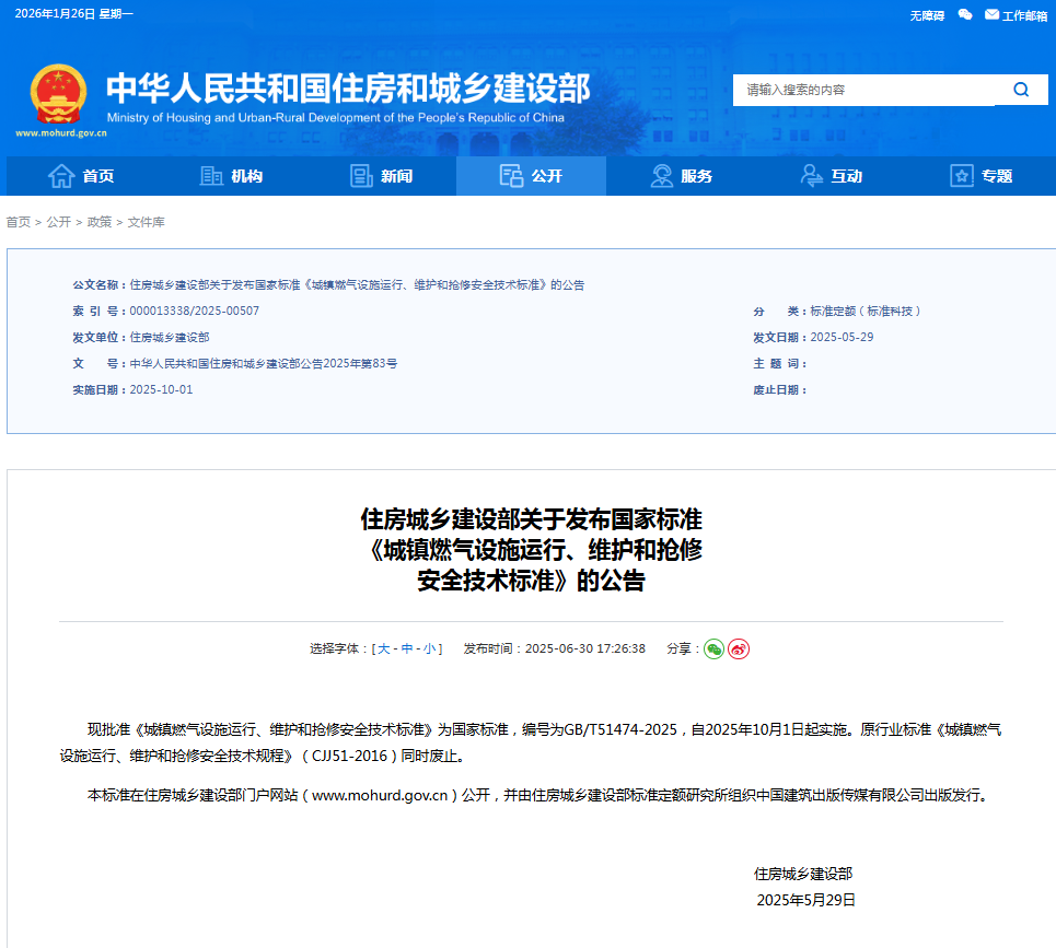 2025年6月30日,住房城乡建设部发布公告:批准《城镇燃气设施运行、维护和抢修安全技术标准》为国家标准,编号为GB/T51474-2025,自2025年10月1日起实施。原行业标准《城镇燃气设施运行、维护和抢修安全技术规程》(CJJ51-2016)同时废止。